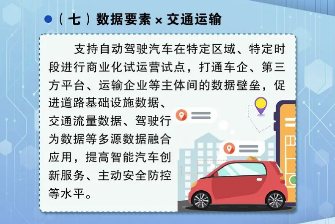 《“數(shù)據(jù)要素x"三年行動計劃(2024-2026年) 》提出,推進智能網(wǎng)聯(lián)汽車創(chuàng)新發(fā)展,支持自動駕駛汽車在特定區(qū)域、特定時段進行商業(yè)化試運營試點,打通車企、第三方平臺、運輸企業(yè)等主體間的數(shù)據(jù)壁壘,促進道路基礎(chǔ)設施數(shù)據(jù)、交通流量數(shù)據(jù)、駕駛行為數(shù)據(jù)等多源數(shù)據(jù)融合應用,提高智能汽車創(chuàng)新服務、主動安全防控等水平。