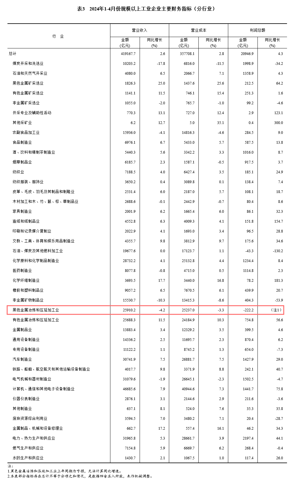 1-4月份,黑色金屬冶煉和壓延加工業(yè)利潤總額-222.2億元。